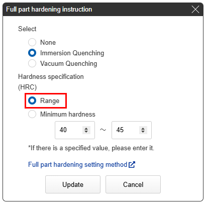 When a hardening type is specified in the Full part Hardening dialog box, the standard hardness range is displayed in the “Hardness specification (HRC)” fields.