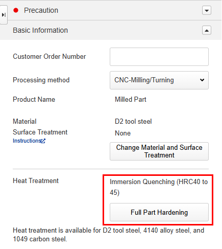 The change to the hardening selection can be confirmed in the “Basic Information” section next to “Heat Treatment” .