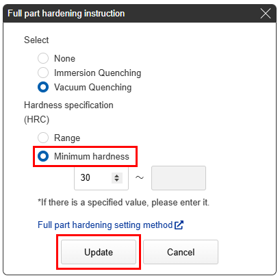 If you want to specify a hardness other than the standard hardness, enter a lower limit and upper limit in the “Hardness (HRC)” input box.