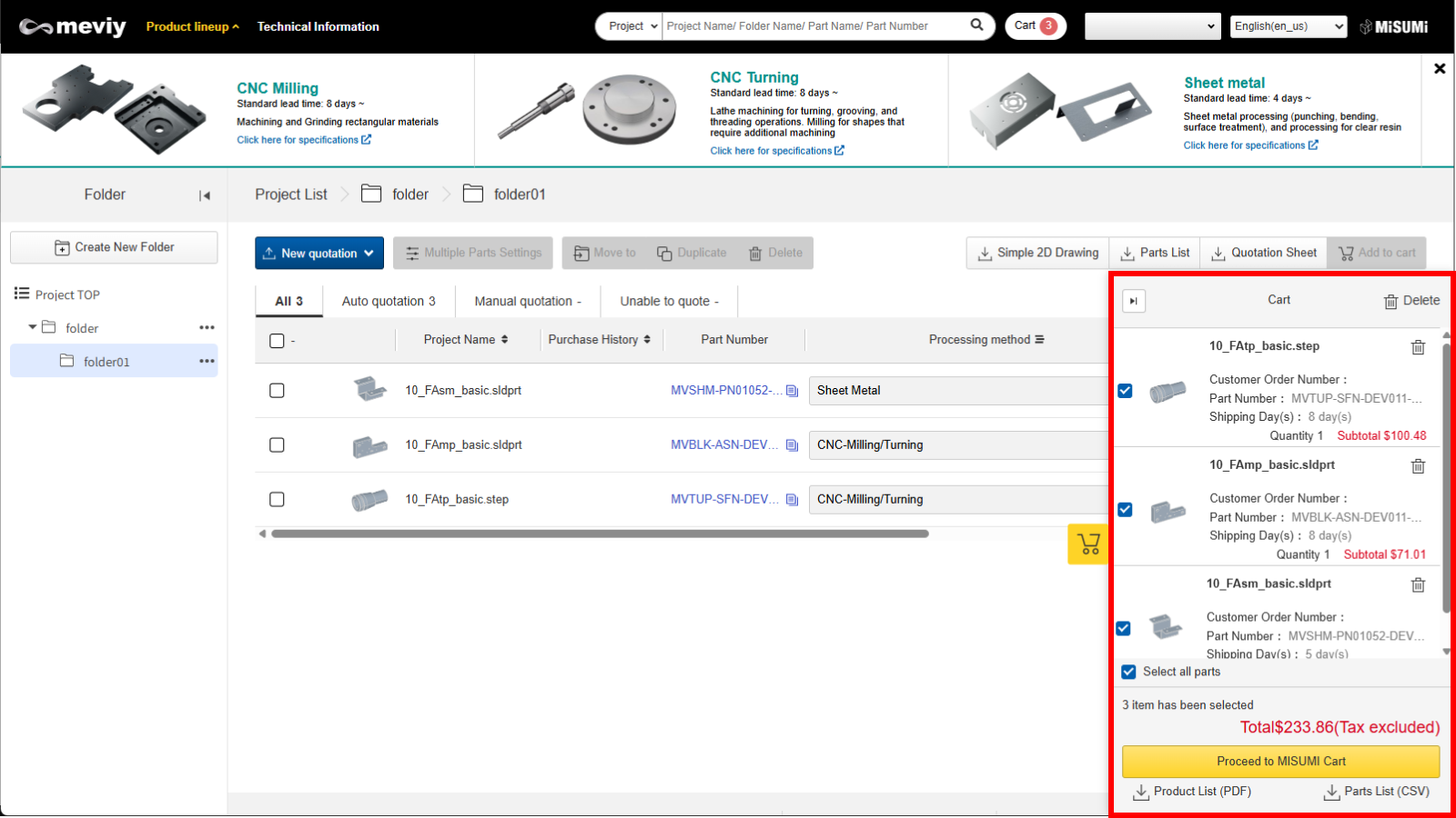 Check the price and delivery time, and if there are no issues, finalize the quote, obtain the part number, and check the quote.