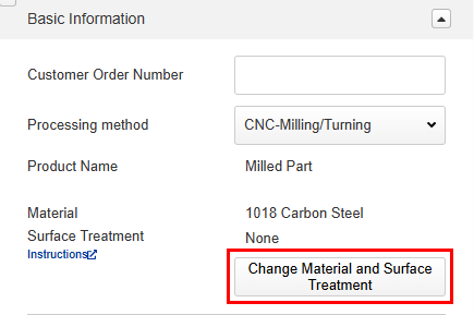 On the [Basic Information] tab, you can change the quantities in the quote, change the materials or surface treatments, set custom customer PO numbers and enter additional machining instructions. Prices and delivery times will be recalculated according to the changed specifications.