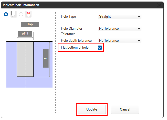 In the [Hole Information] dialog, click “Flat Bottom of Hole” and click [Update].