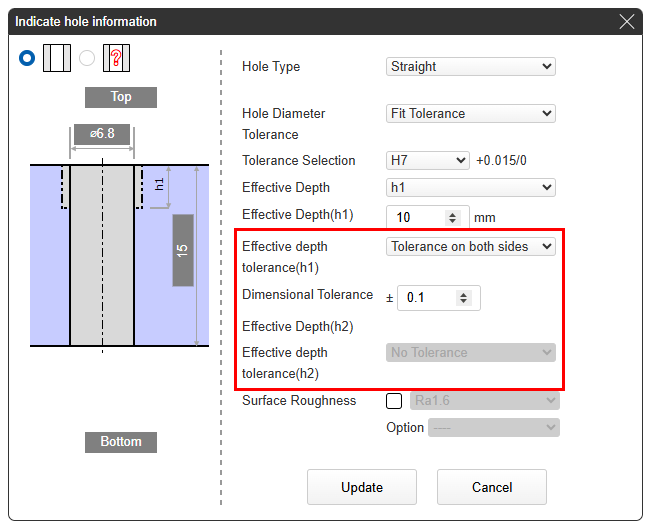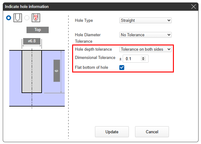 In the Hole Information dialog box, select a hole depth tolerance or an effective depth tolerance, and then click Update.