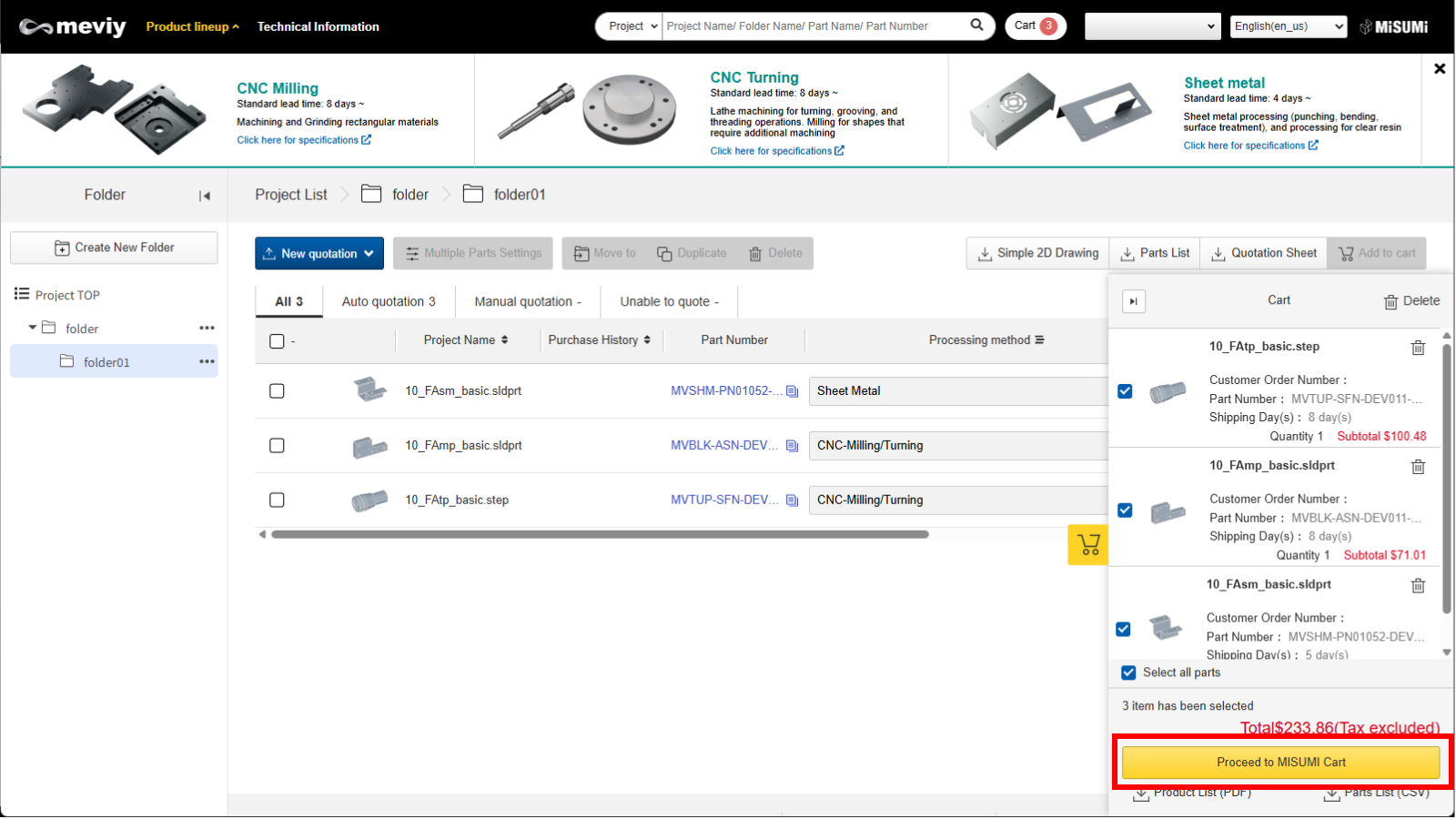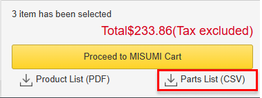 Misumi web order system allows you to order catalog parts and parts quoted on meviy at the same time. If you want to order catalog parts and parts quoted on meviy at the same time, downloading and processing the meviy quote data makes it easy.