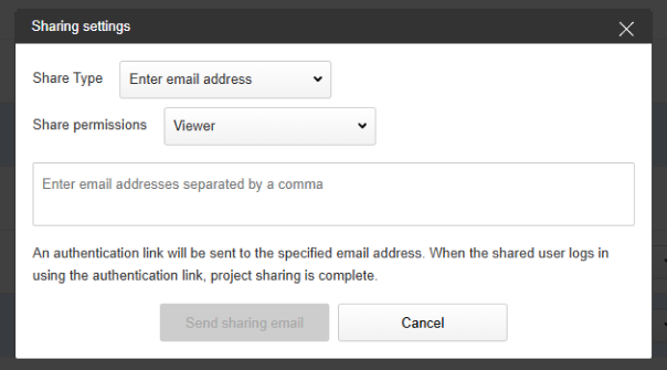 If the share type “Enter an email address” is selected, projects can be shared with users who do not have a Misumi user account.