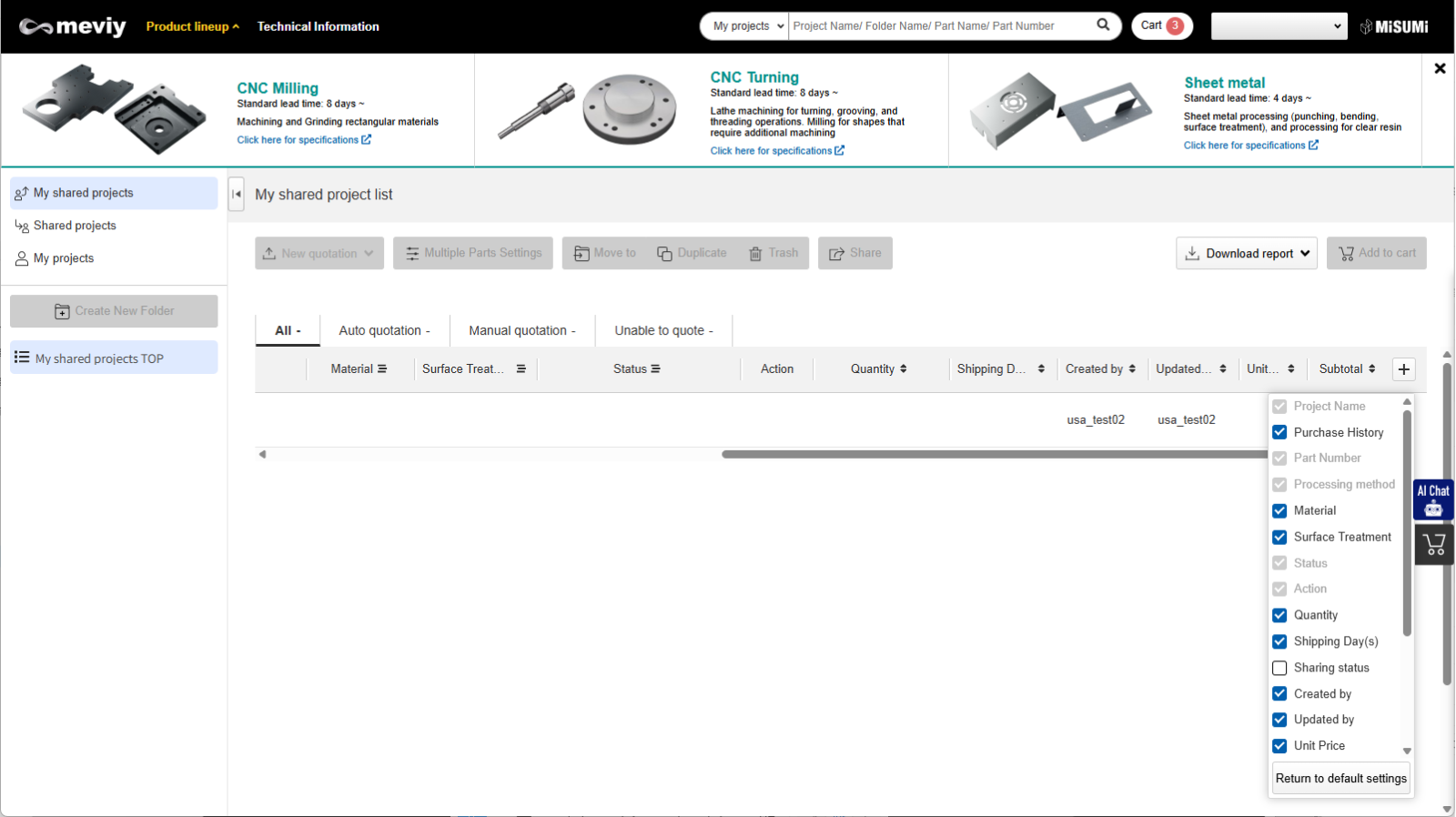 Other users can view shared projects and modify part specifications and request quotes in the 3D viewer.