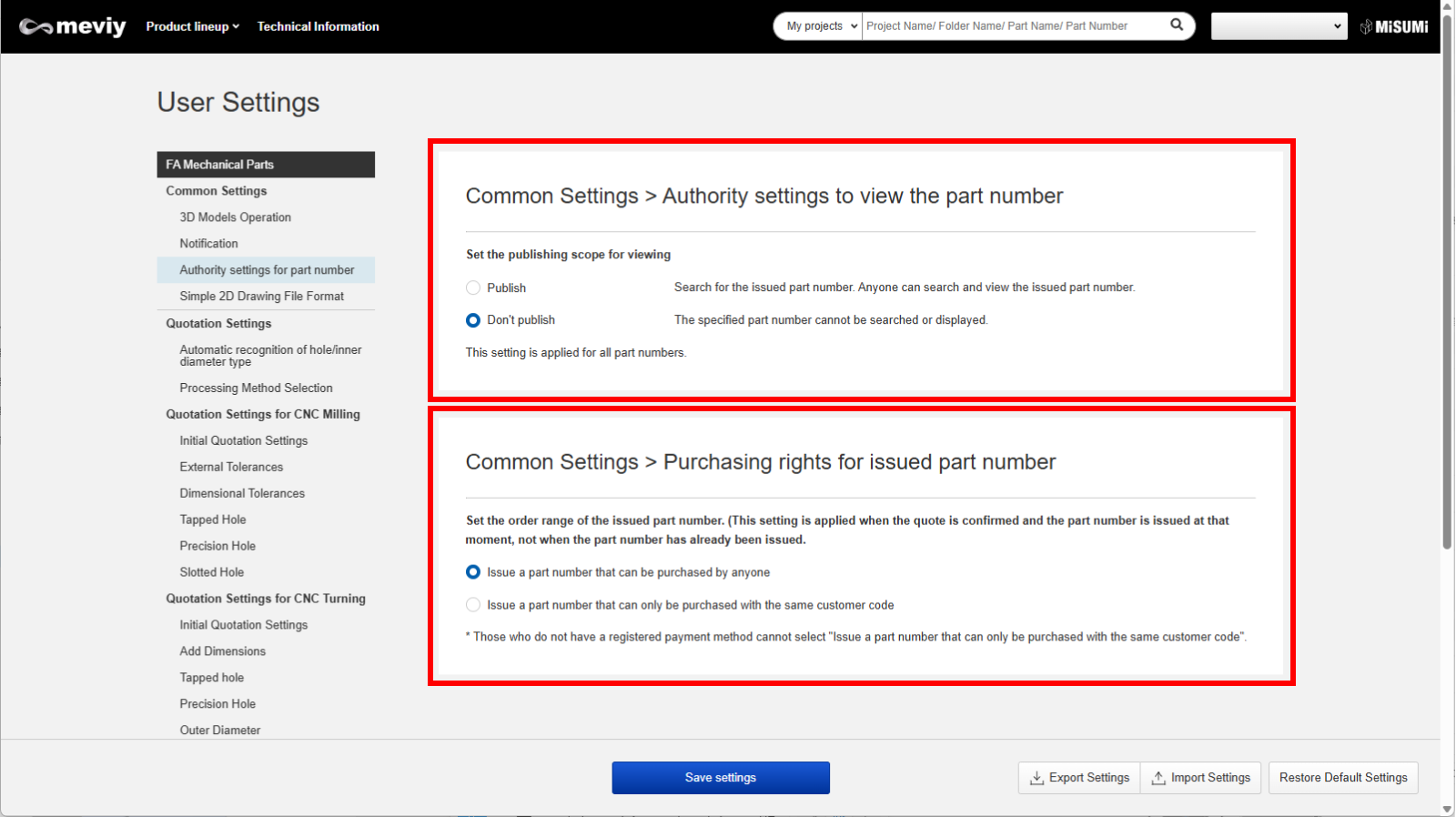 - If Person B issues a part number for a project uploaded by Person A, the user settings of Person B will determine the part number’s viewing and purchasing permissions.