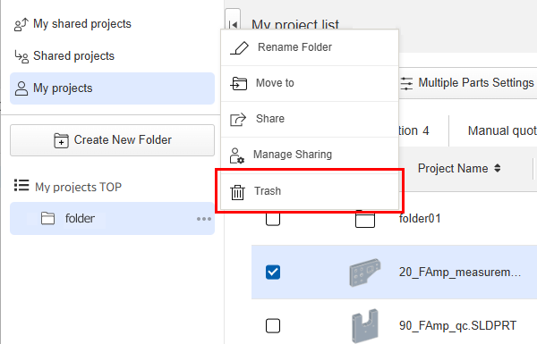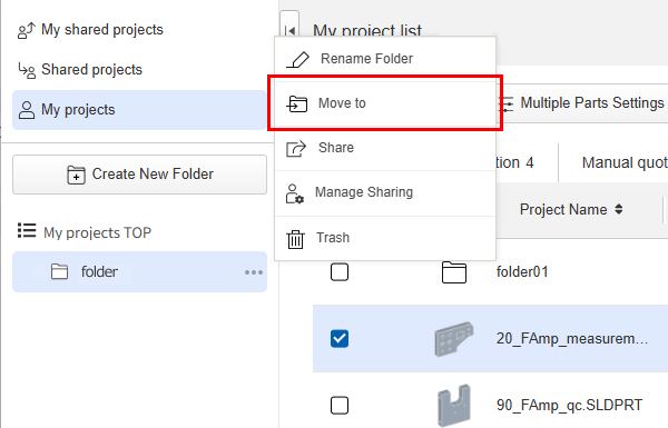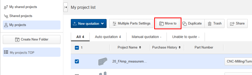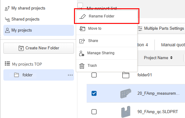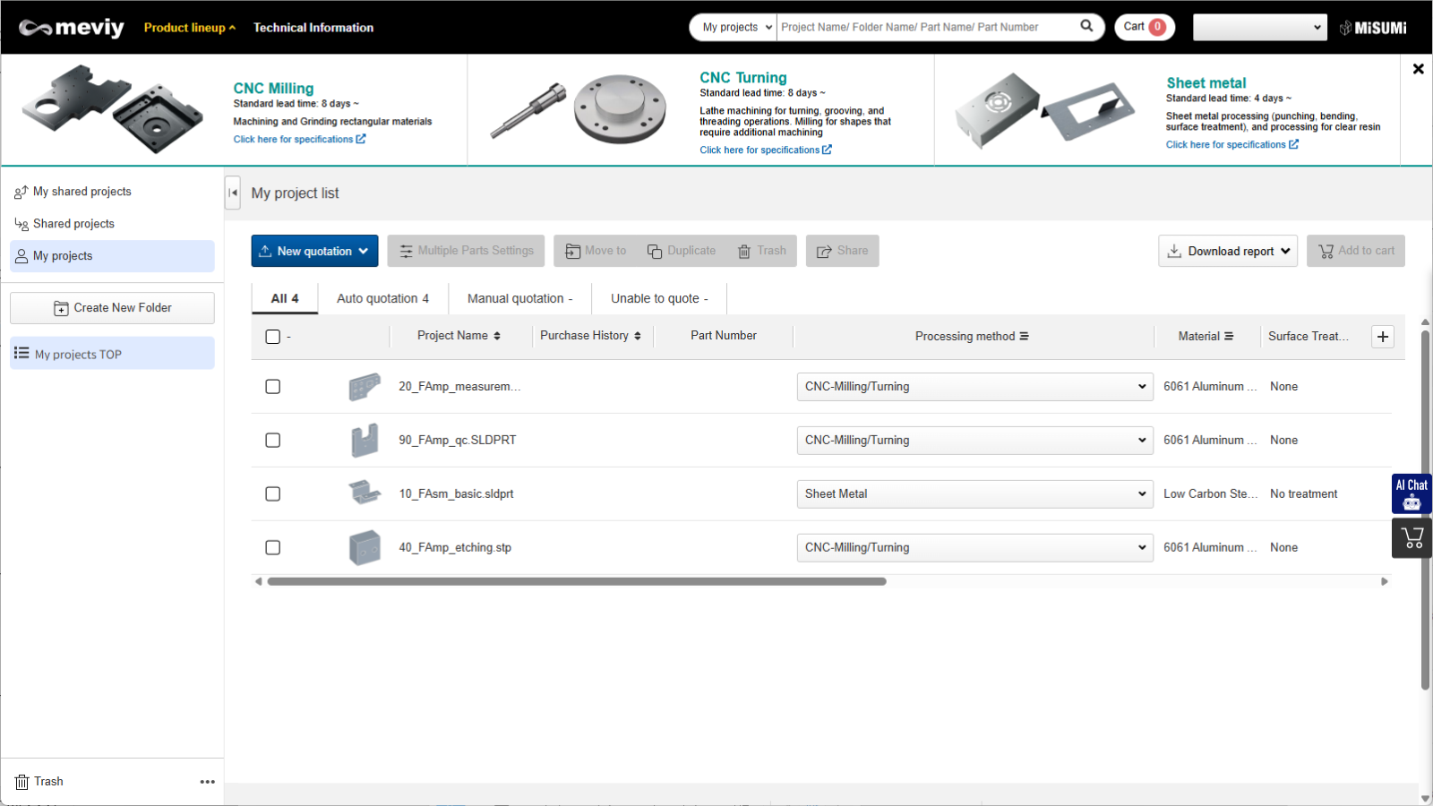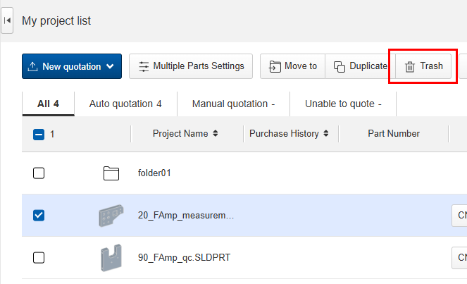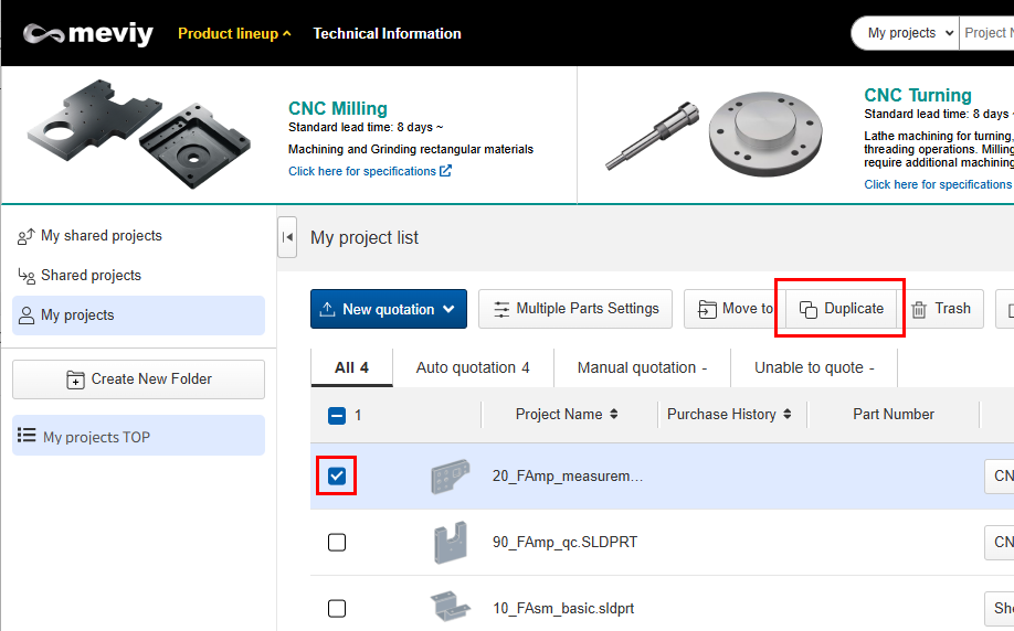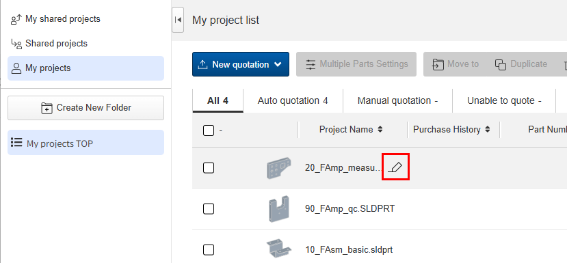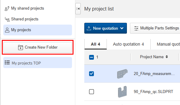 3D data uploaded to meviy is displayed in the project list screen as a “Project” where you can see part previews and project names and check the progress and results of quotes. This section describes how to organize projects in a way that makes them easy to access and use.