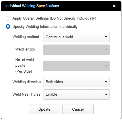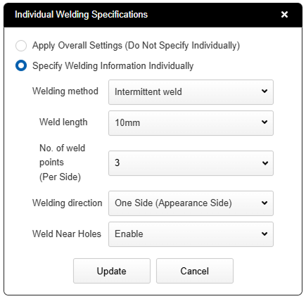 - [Individual Welding Instruction] In the dialog box, you can select different welding methods, welding directions, and whether to weld near holes for each welding location, distinct from the overall welding information.