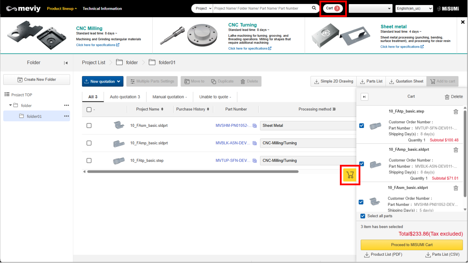 1. Return to the project list and add the parts you want to your cart to check the quotation results.
