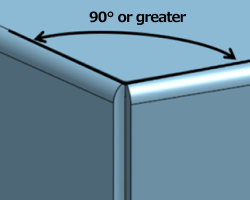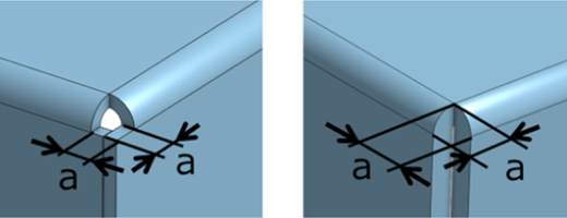 • For corner welds, we recommend modeling with cutout sizes within twice the plate thickness (per side) and angles where bends and welds intersect at 90 degrees or greater.