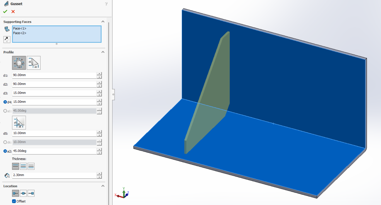 – [Thickness] – Select [Both Sides], set [T1: Plate Thickness Dimension ] to 2.3mm [Position] – Select [Profile Position @ Start Point]