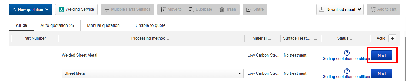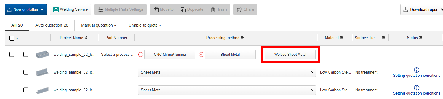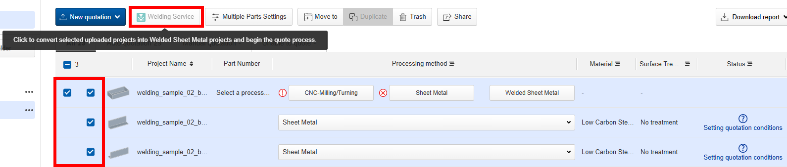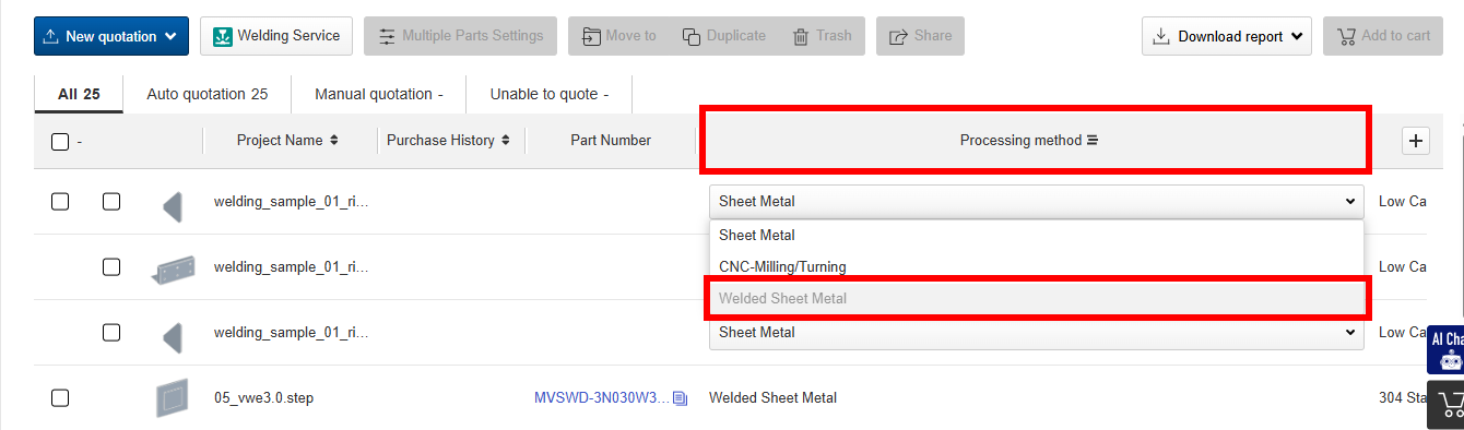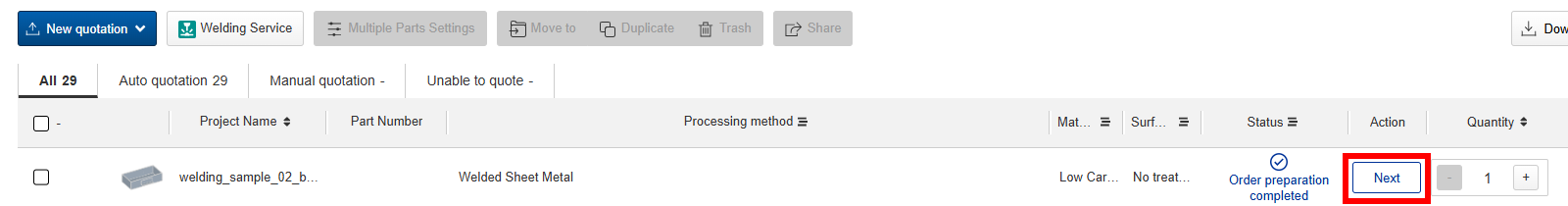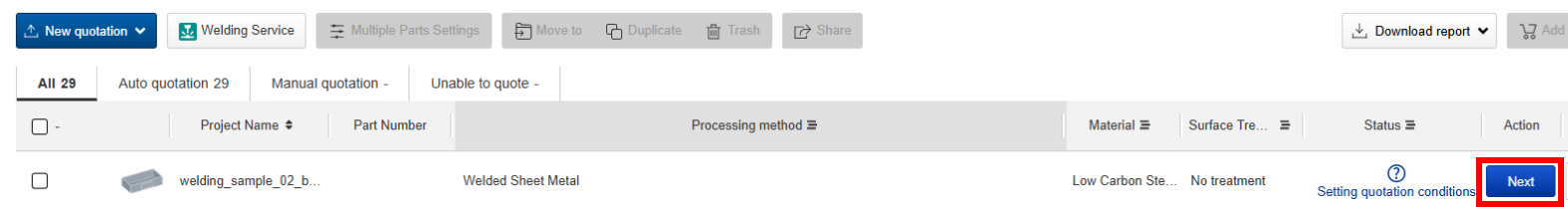 Open the meviy project list, upload the saved 3D data, then select [Welded Sheet Metal] in the processing method field.