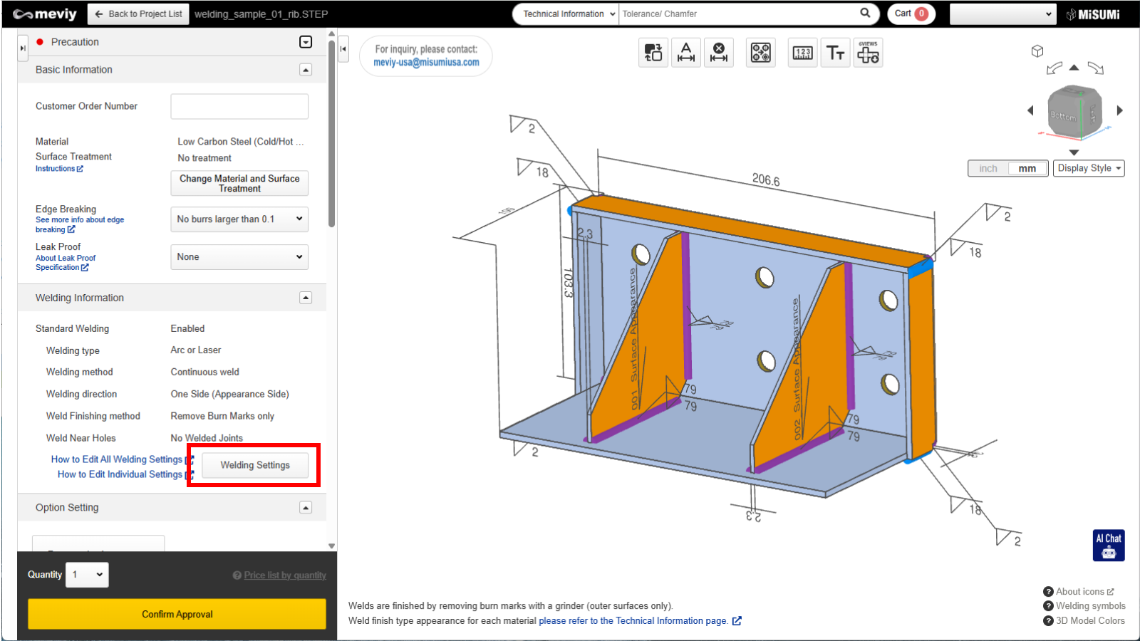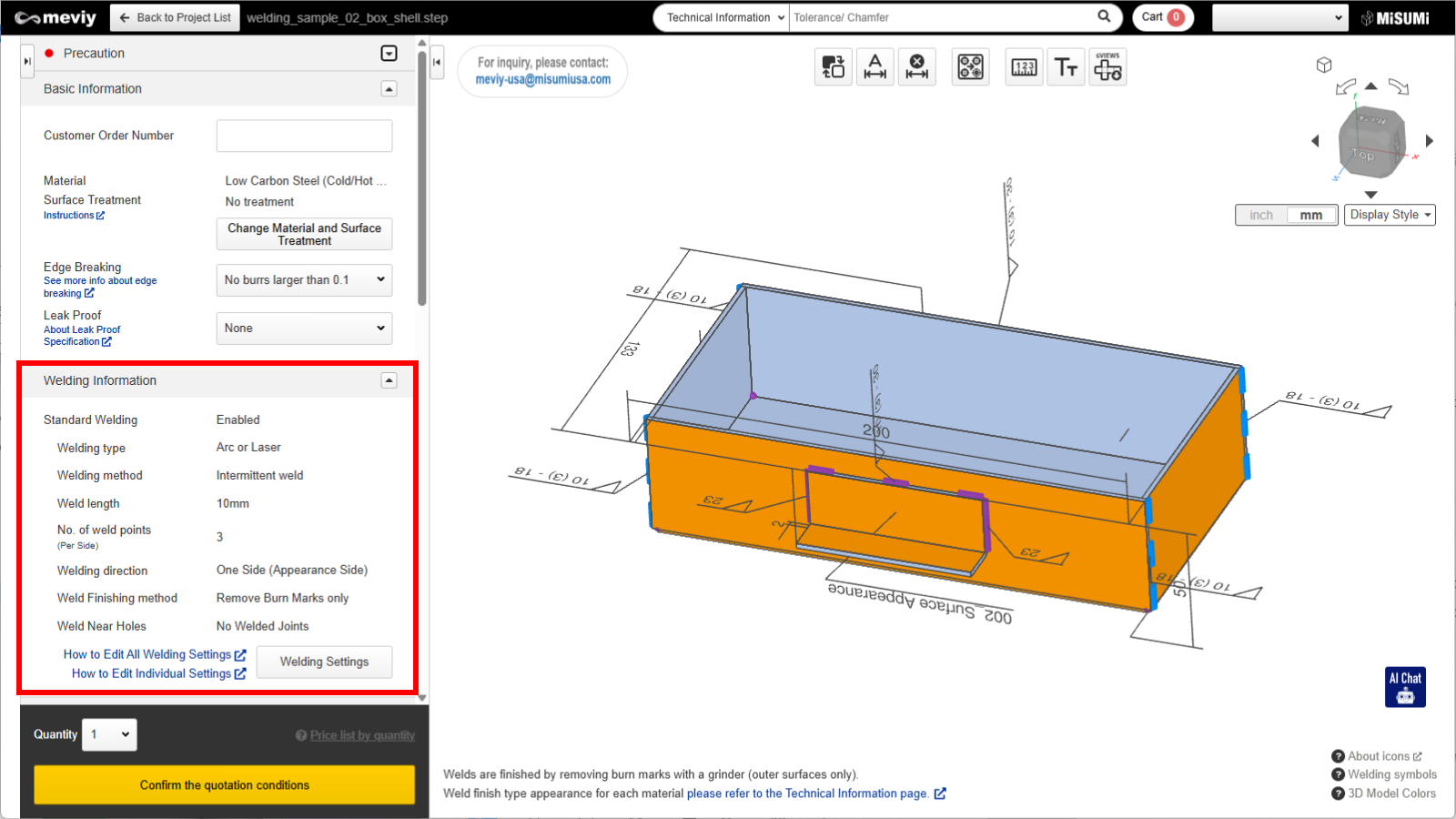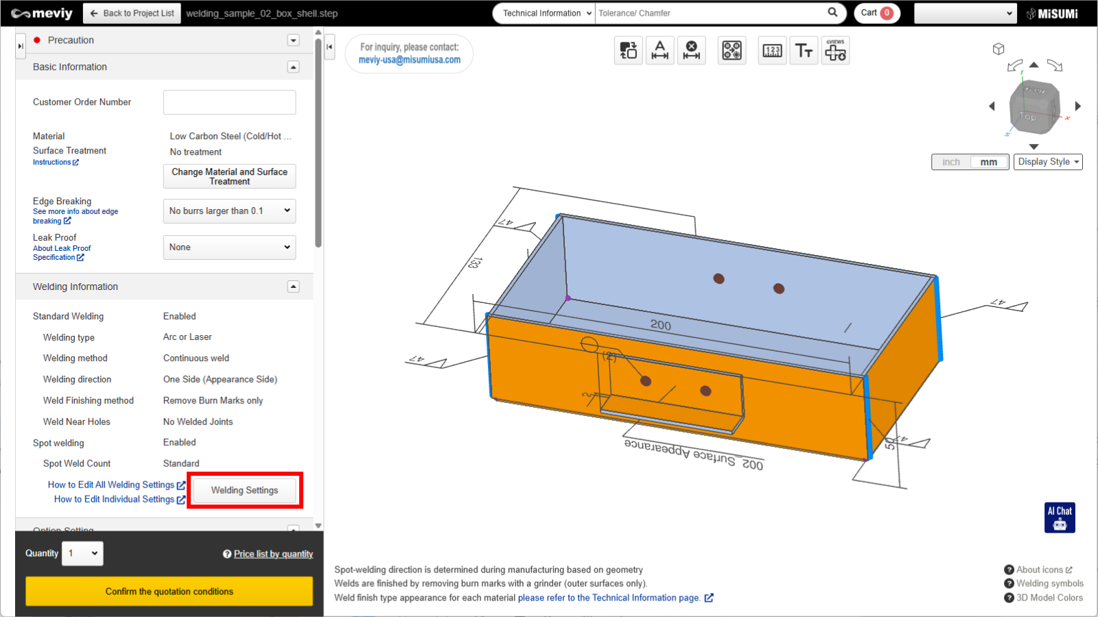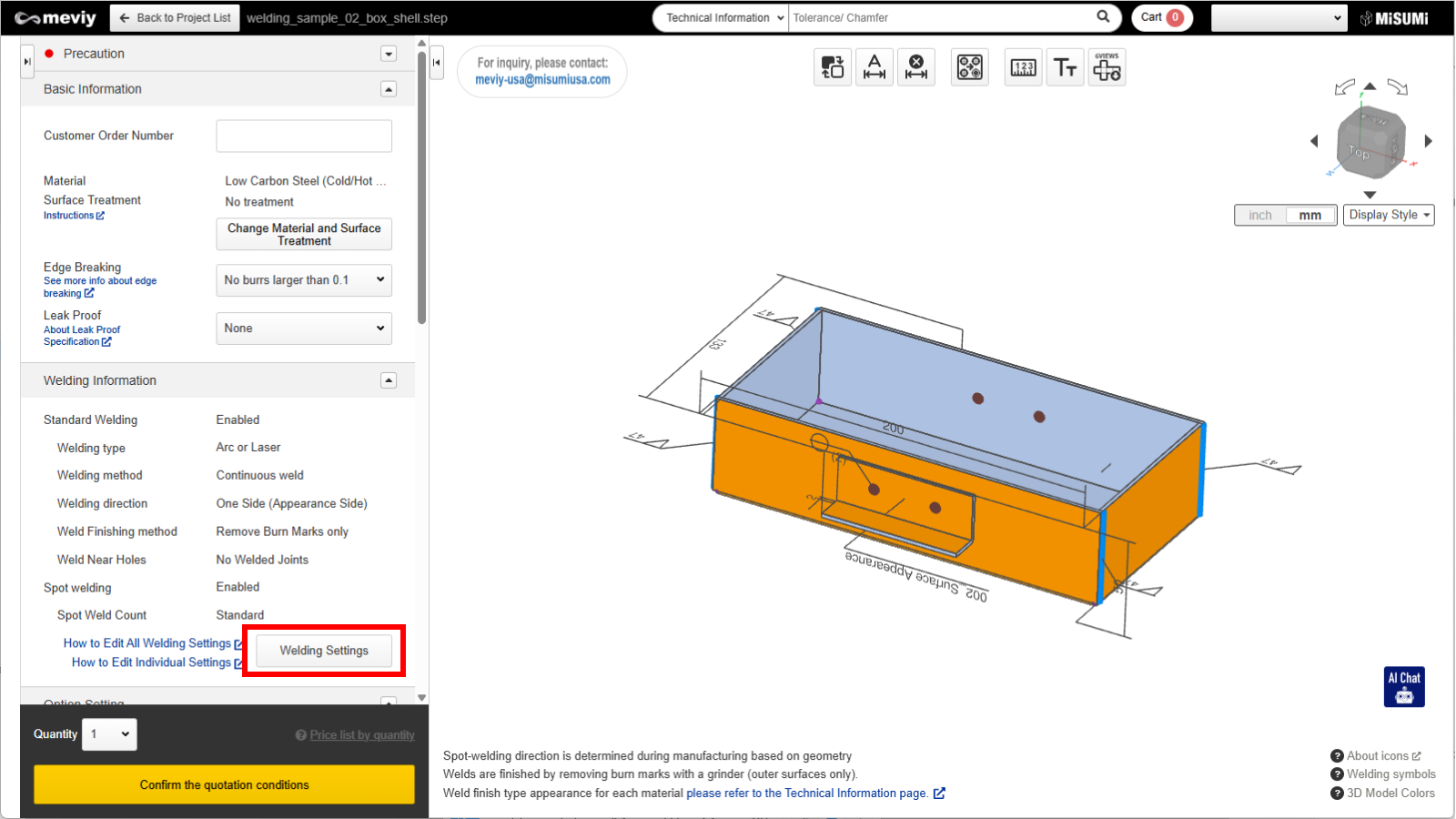 After editing the welding information, confirm the 3D viewer has updated and press the “Confirm Quotation Conditions” button.