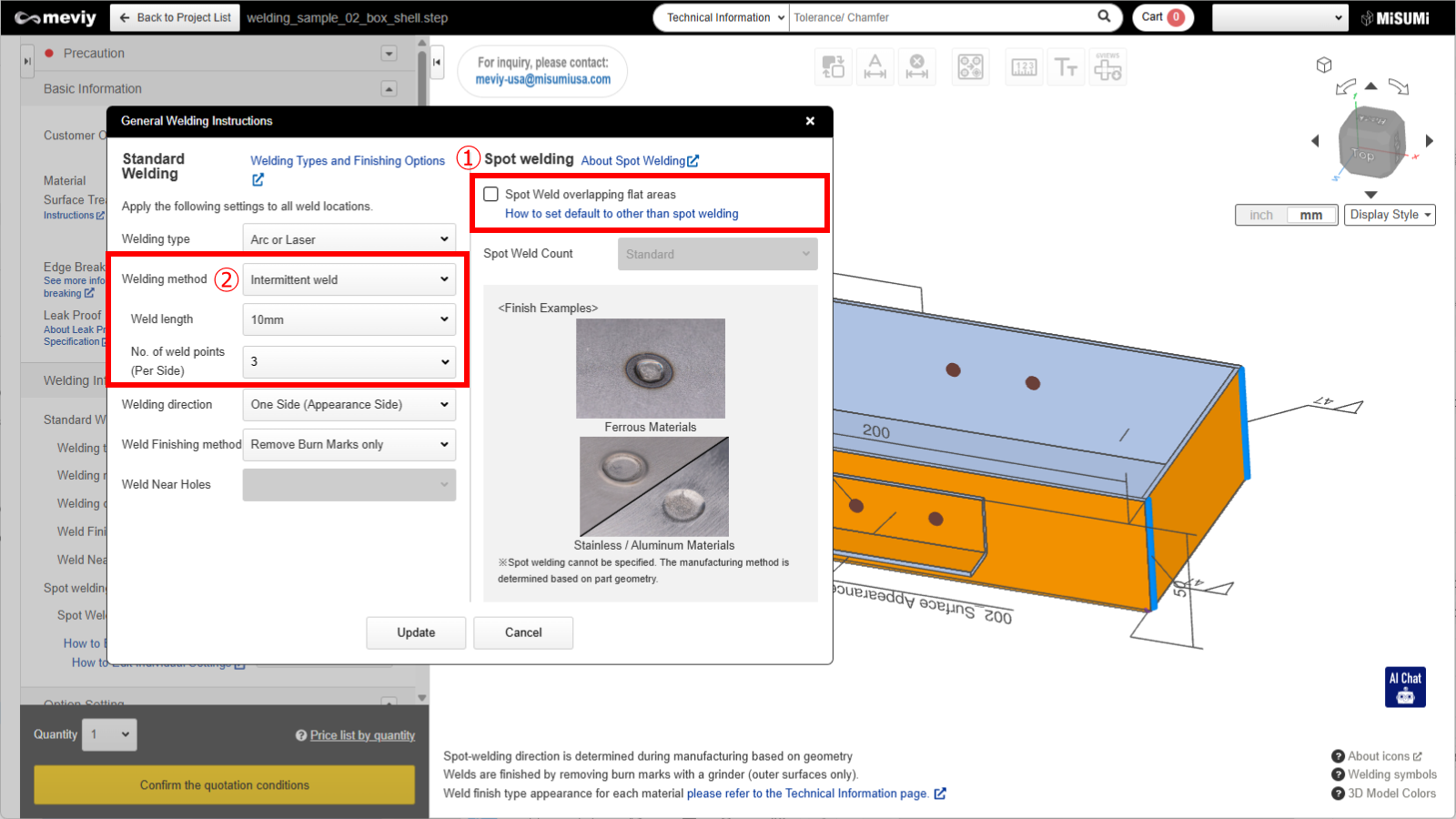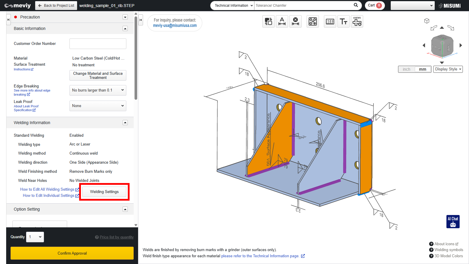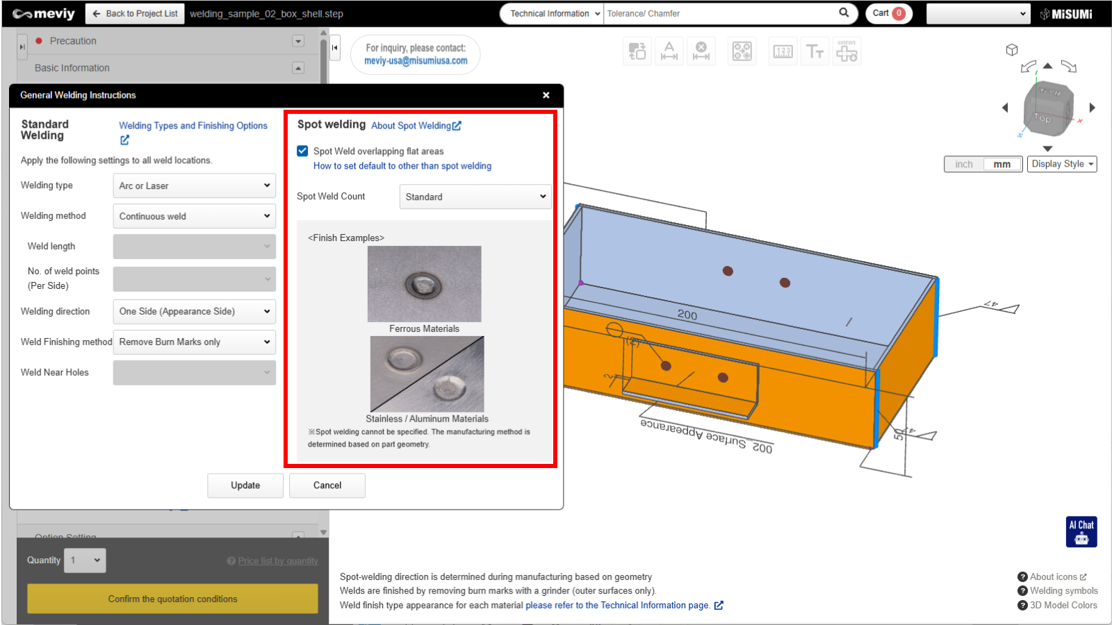 After editing the welding information, confirm the 3D viewer has updated and press the “Confirm Quotation Conditions” button.
