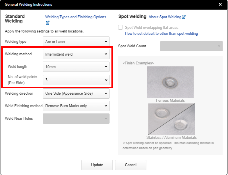 To change the welding method, set it f r o m [Continuous Welding] to [Intermittent Welding] ( weld length 10mm, 3 points per side), then press the Update button.