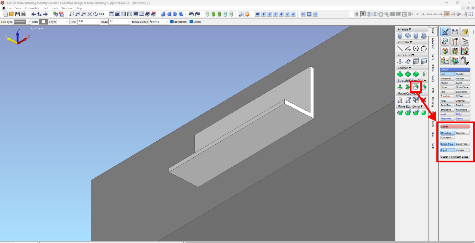 From the [Basic Tab] – [Stretch/Shape/Cut] – [Create Equal Fillet] command, select [Corner Edit] – [Fillet] – [Single Operation] – [Equal]