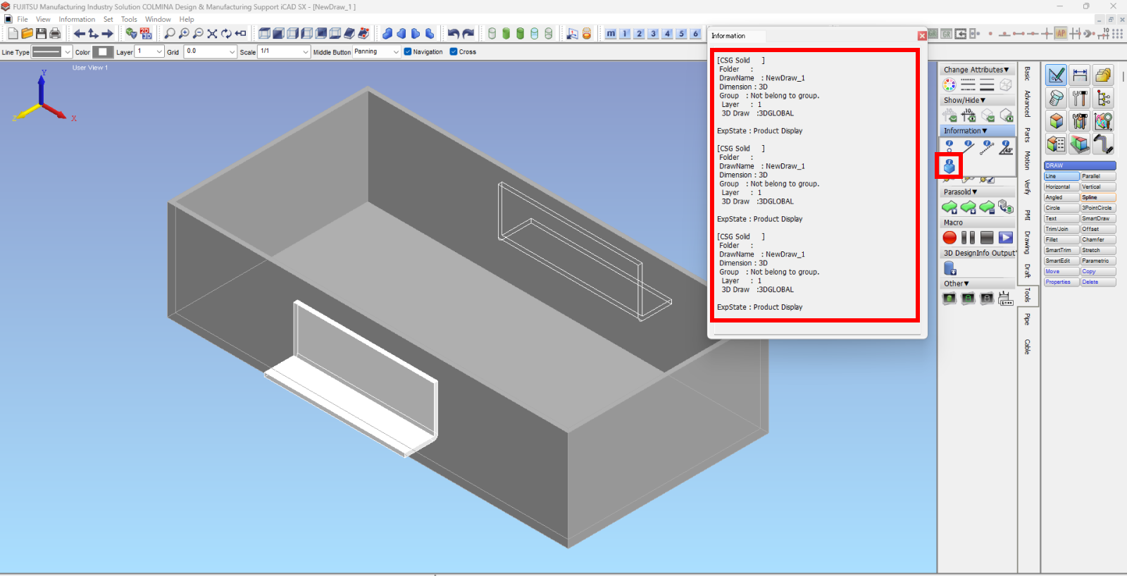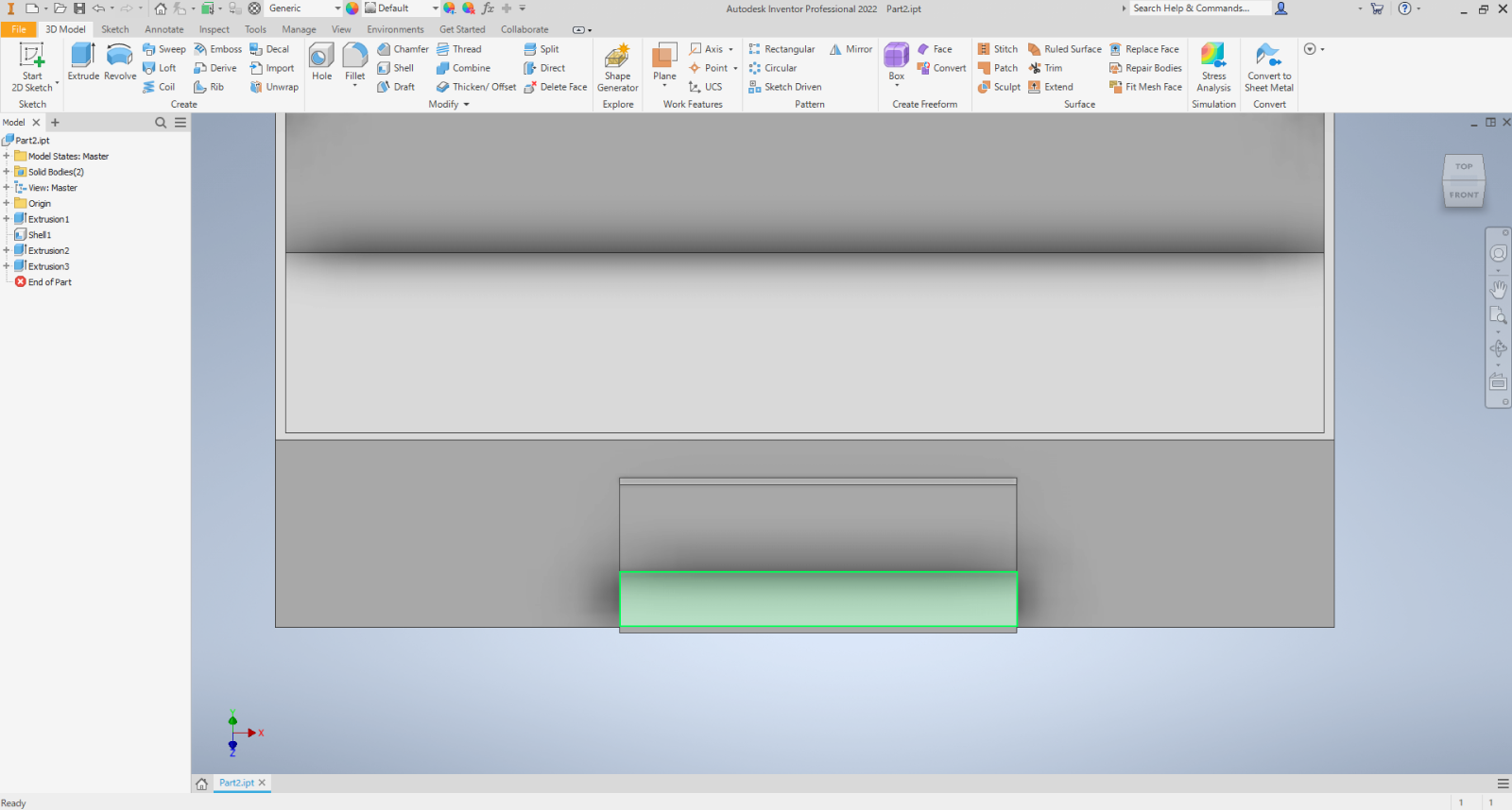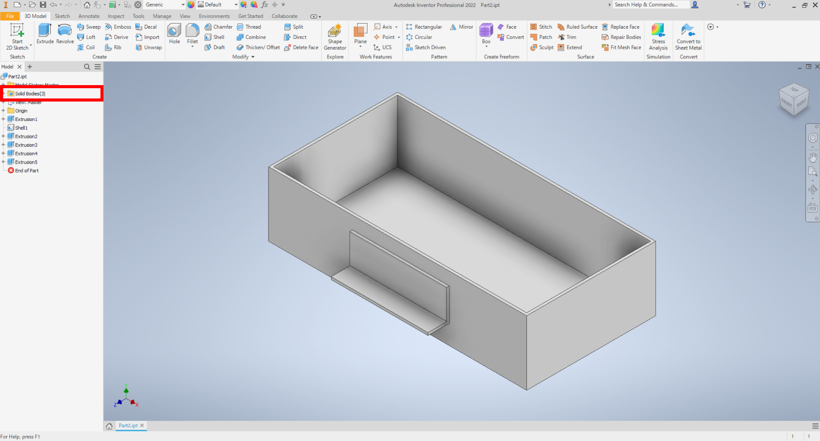 Check the number of solids before saving the CAD file. (Total of 3 solids: Box 1, Handle 2)