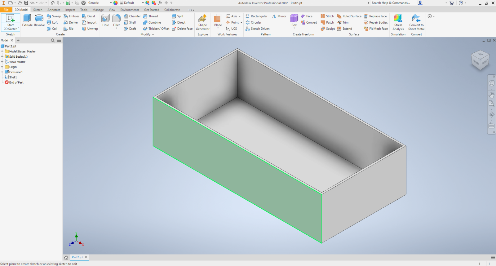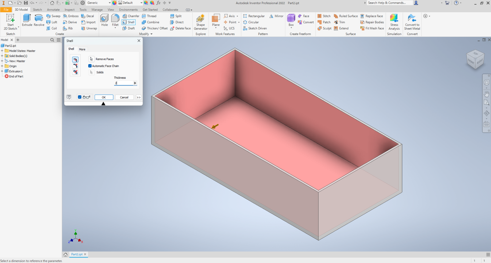 [Shell] – [Surfaces to Remove] – Select the model’s TOP surface