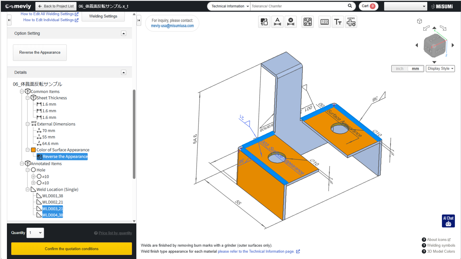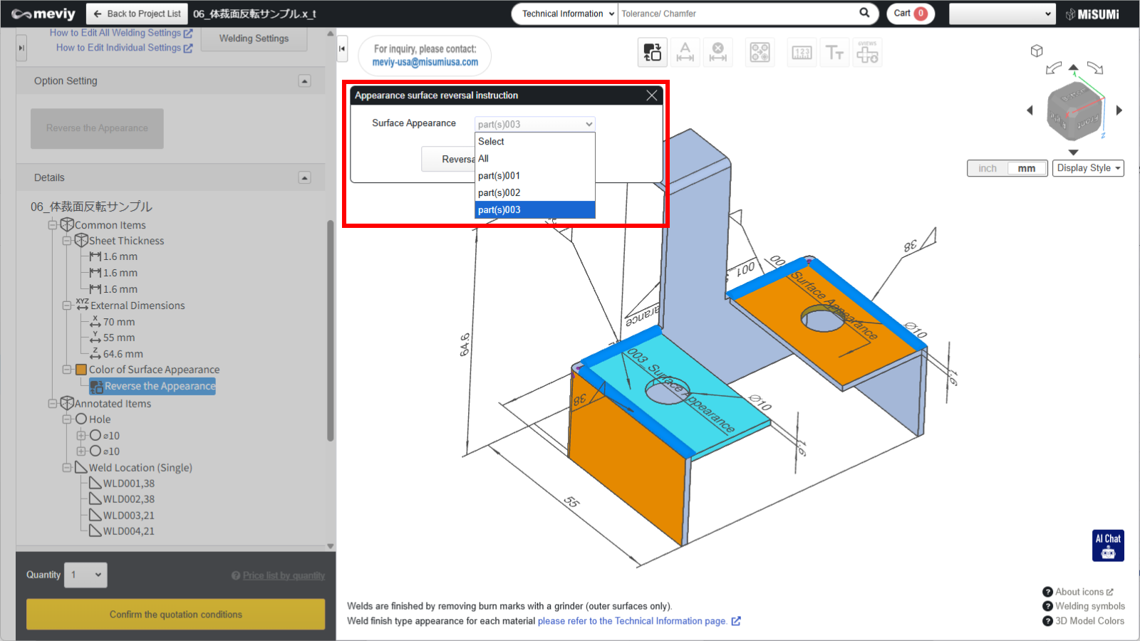 In meviy Welded Sheet Metal, the appearance can be reversed for each part.