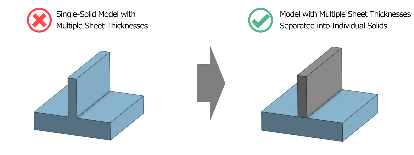 For Welded Sheet Metal parts composed of two or more sheet thicknesses, model each thickness as a separate solid.