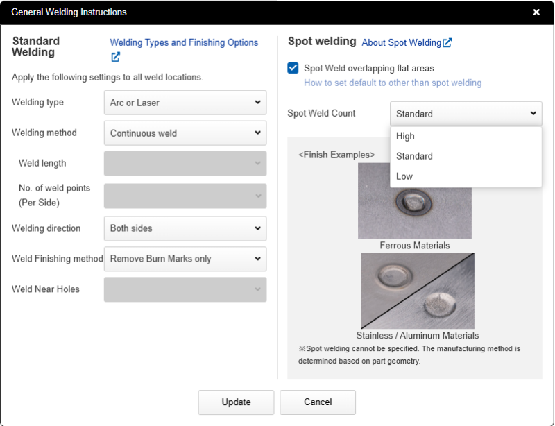 - Spot weld finishing is performed using specific methods based on material properties, regardless of the welding finish type selected for conventional welding (arc welding, laser welding).