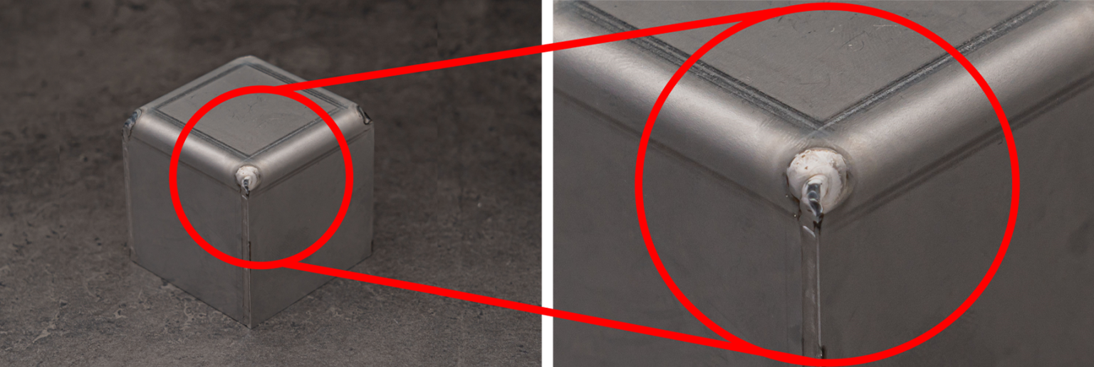 - For box-shaped corners, weld and fill holes from the outer side at locations indicated by purple spherical highlights in the 3D viewer.